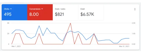 We took over the account in March with initial metrics showing 18,288 impressions, 495 clicks, and only 8 conversions. The cost per conversion was high at $821. Initial strategies focused on boosting ad reach, reducing costs, and improving targeting.