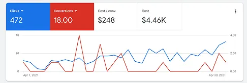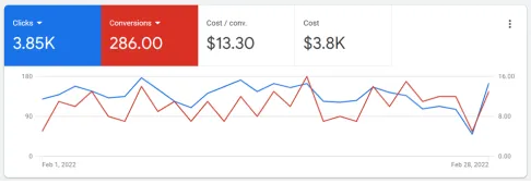 By February, conversions reached 286, and the cost per conversion dropped to $13.30. The conversion rate was 7.42%, demonstrating significant growth and cost-efficiency since March.