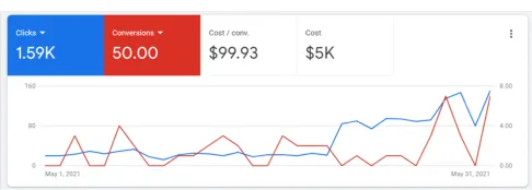 By May, impressions and clicks increased steadily. Our efforts to optimize targeting and ad copy led to lower average CPC and better engagement. Conversions began to rise, setting the stage for more growth.