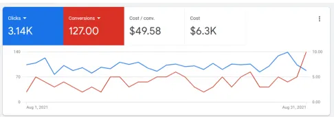 In August, impressions surged to 312,584, with clicks at 3,137 and conversions at 127. The cost per conversion dropped to $49.50, reflecting improved efficiency, while the conversion rate rose to 4.05%.