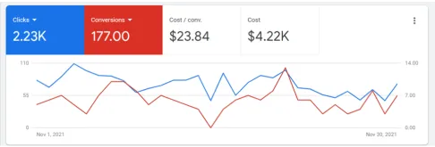 November saw impressions rise to 545,586, with conversions reaching 177. Cost per conversion fell to $23.84, while the conversion rate improved to 7.94%, showing effective optimizations and better results.